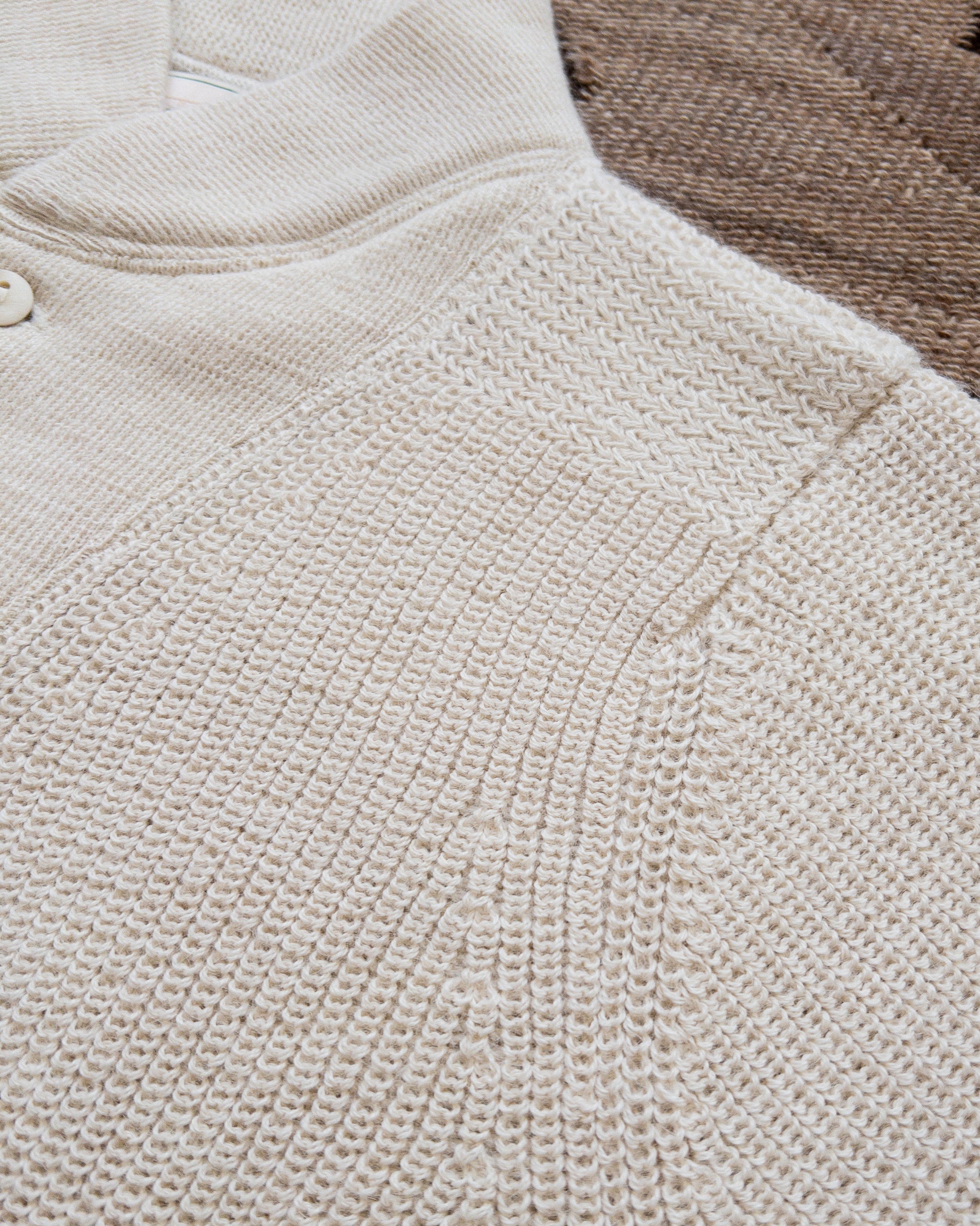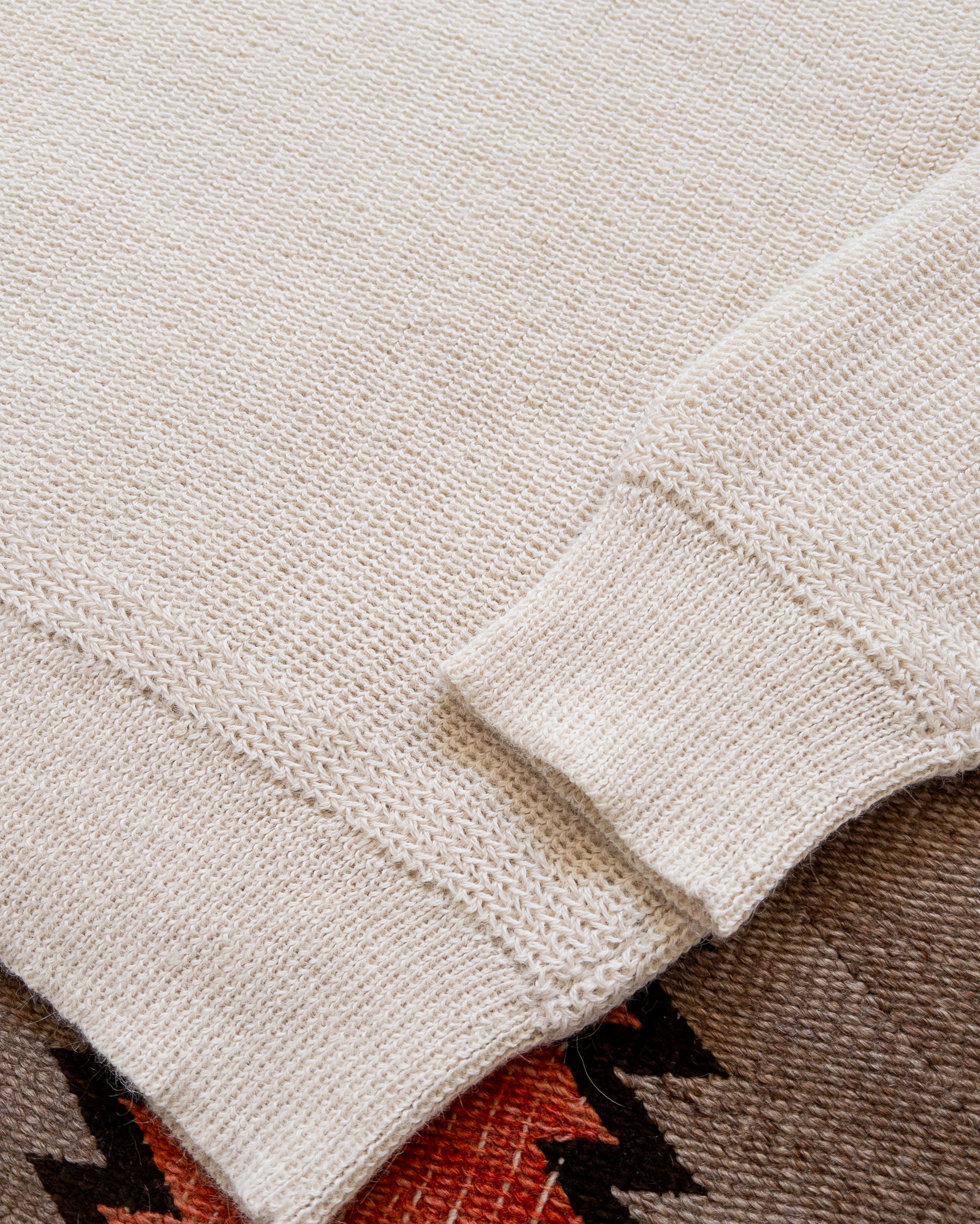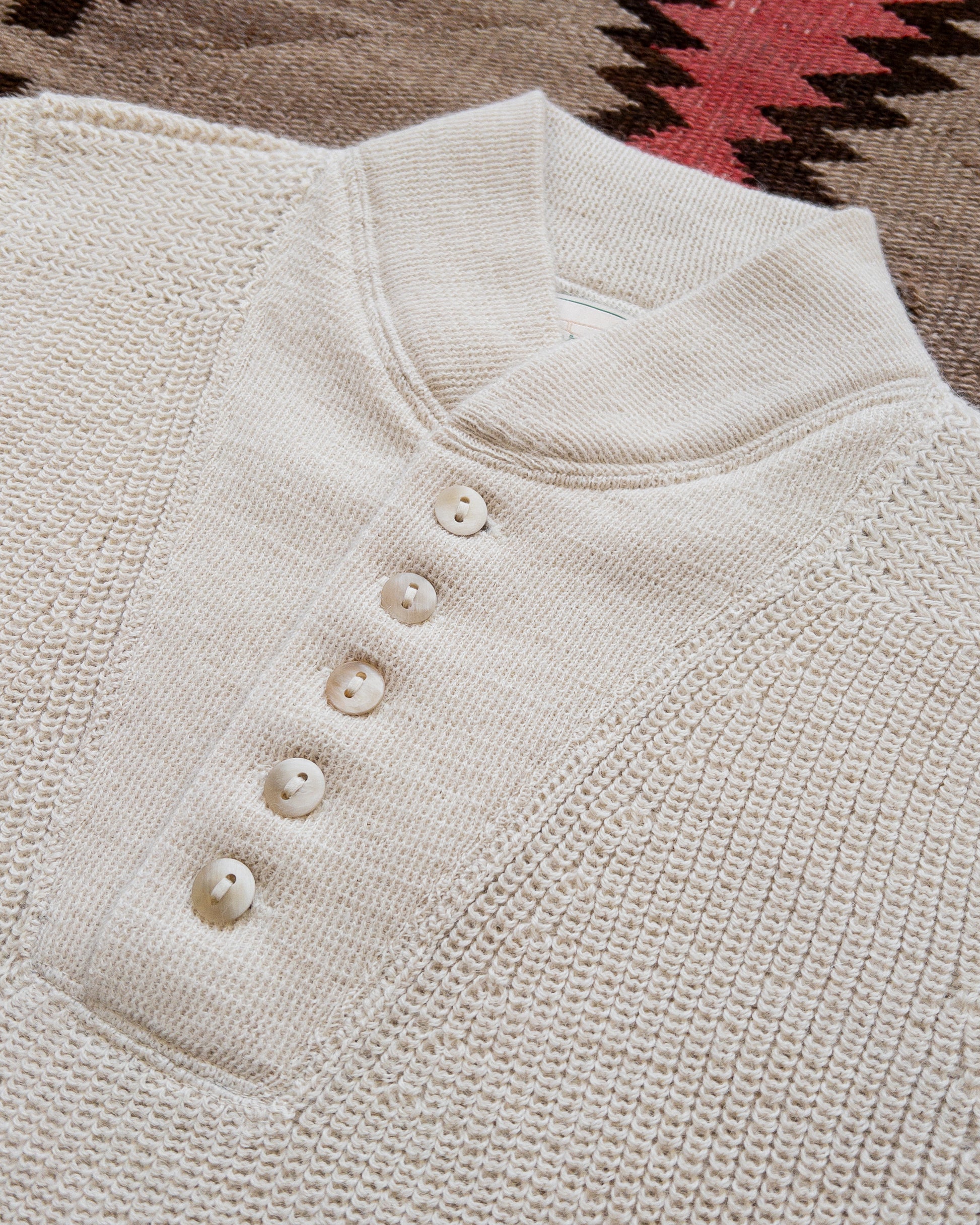 These are based off the original, 1938 naval henley. For our iteration, we opened up the knit a bit more to make it feel less dense, a bit looser, and added some hand details for cleaner finishings. This henley uses the same gauge of yarn throughout the whole sweater, but in 3 different plies. These plies change in seamless transitions between the body, the collar, and the hems. And this is really where the handwork shines through.