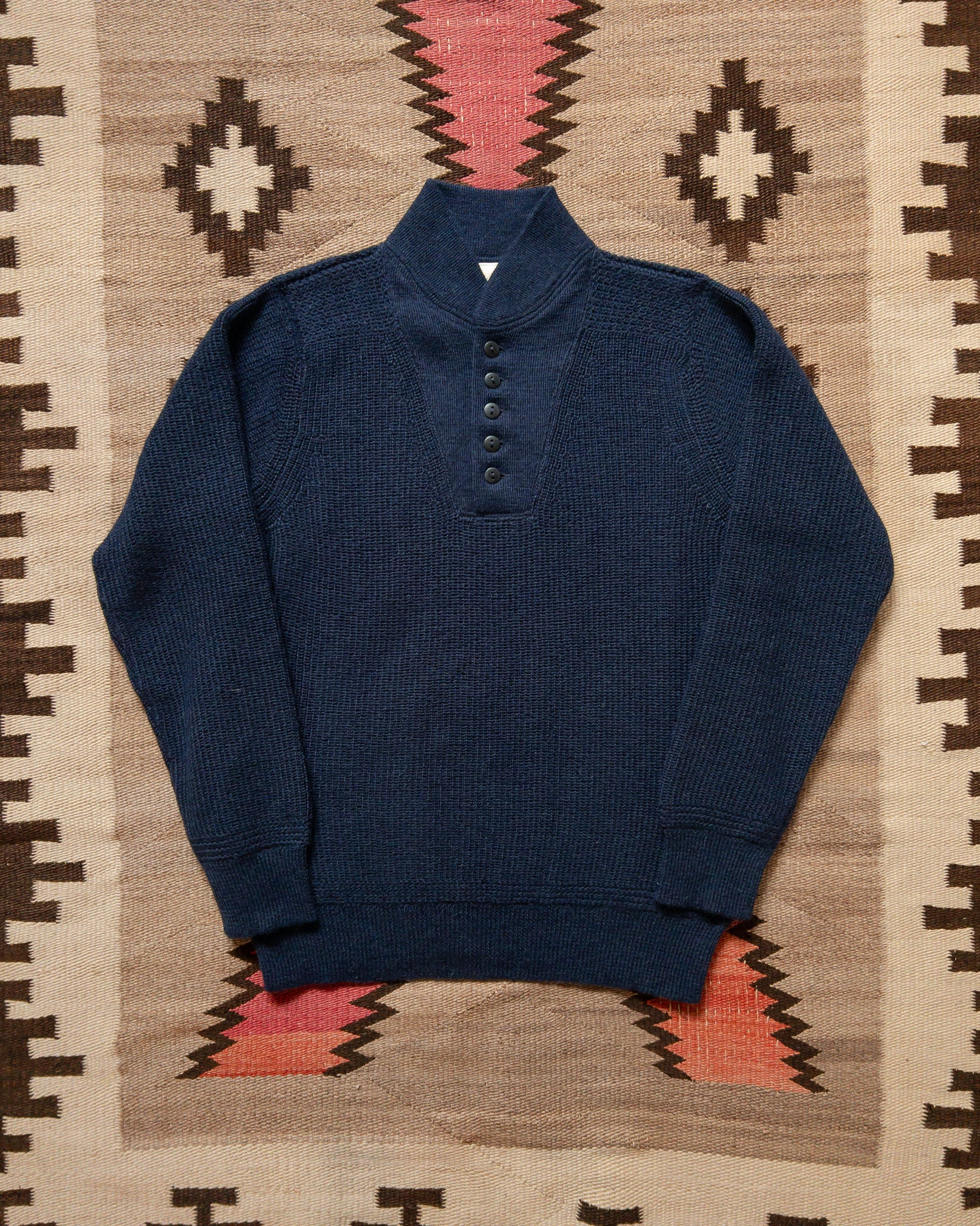 These are based off the original, 1938 naval henley. For our iteration, we opened up the knit a bit more to make it feel less dense, a bit looser, and added some hand details for cleaner finishings. This henley uses the same gauge of yarn throughout the whole sweater, but in 3 different plies. These plies change in seamless transitions between the body, the collar, and the hems. And this is really where the handwork shines through.