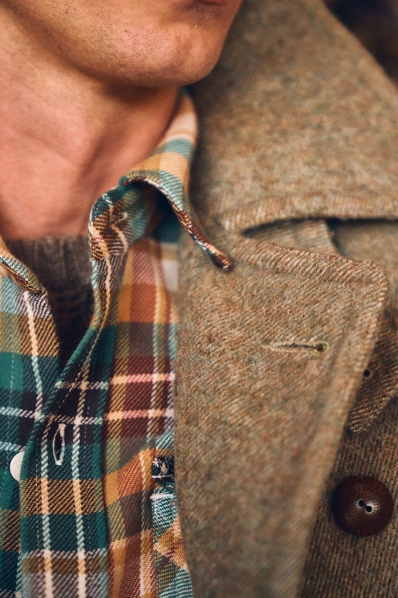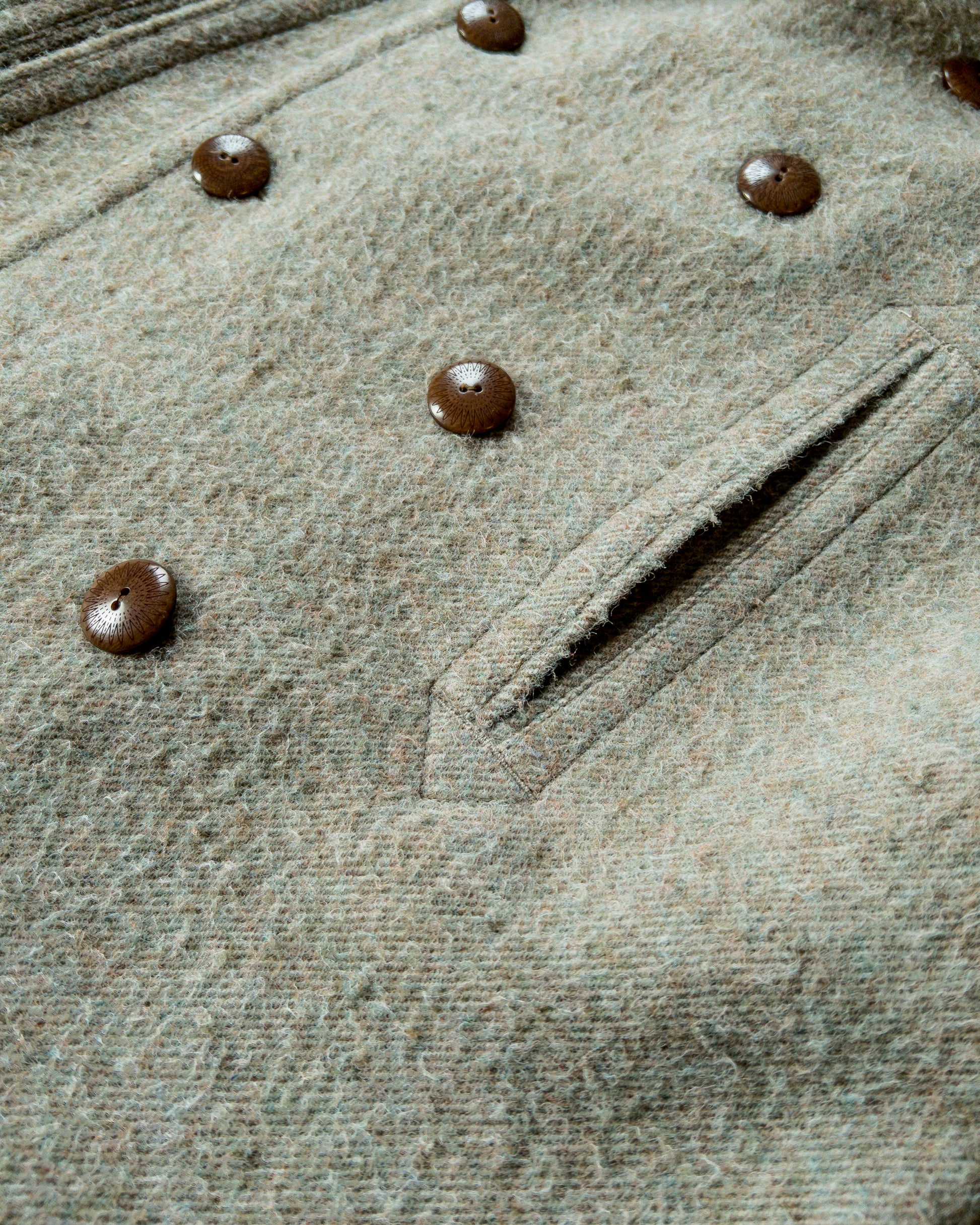 This coat is a culmination of multiple points of research, reference, and inspiration. Upon digging through survey photos of loggers in the PNW and American Midwest, we came across one in particular that featured a logger wearing a weathered and worn peacoat. You could tell this thing had carried him through multiple winters and was one of, if not, his only coat. And that's our favorite kind of inspiration; clothes that have been not only well-loved, but lived in, relied upon, and beaten to death.