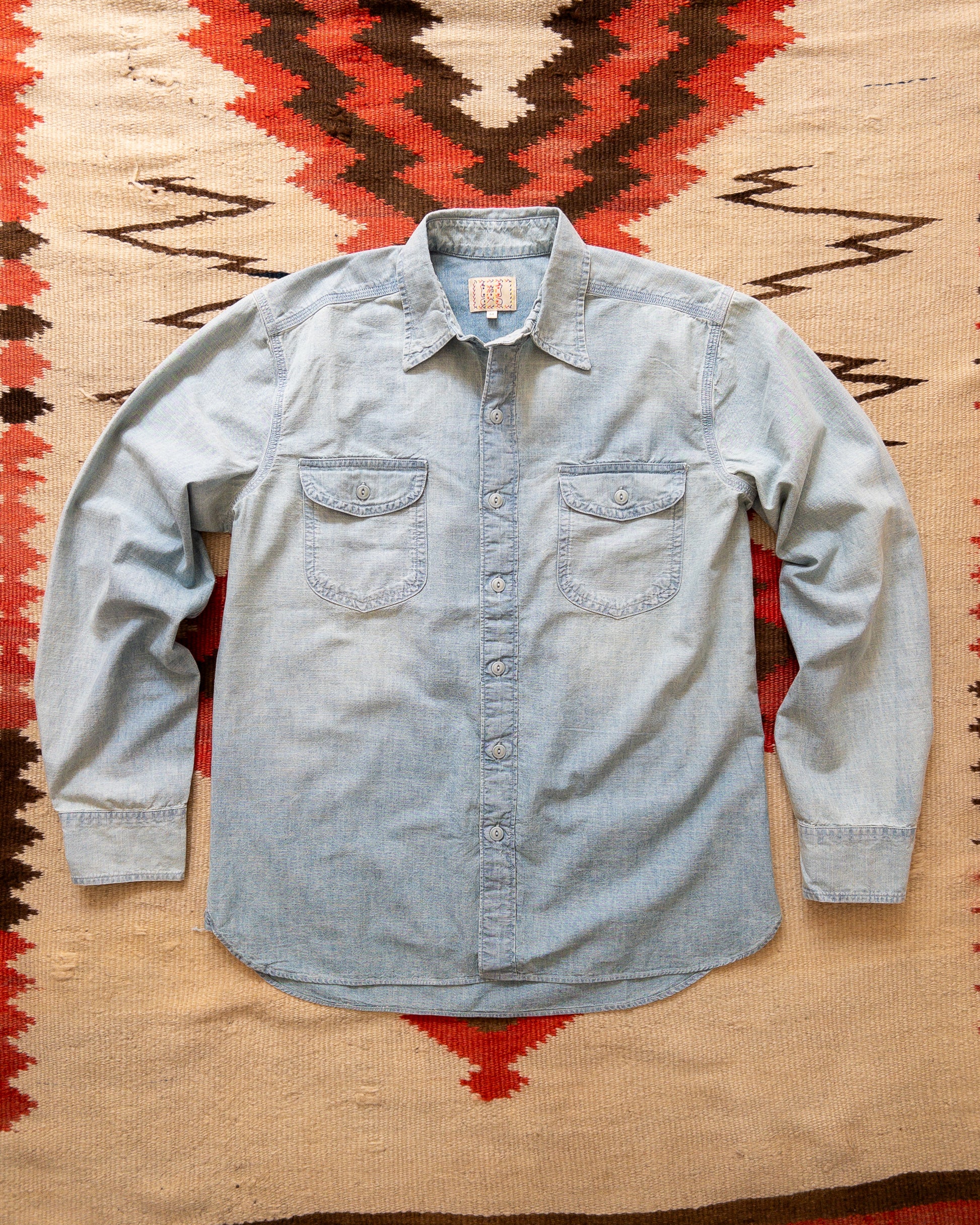 I know we say this again and again, but this is a true classic. Hardy chambray shirts were the workforce shirt used by everyone from US Naval Sailors, railroad workers out west, to grainbasket farmers and their families. Loved by Paul Newman in "Cool Hand Luke" and evolved into a Rivera staple in the 60s and 70s. Chambray pairs equally well with blue jeans as it does with khakis and suitings. The Wythe chambray used indigo dyed yarns chosen carefully for their irregular slubs to retain the same character as the original chambrays that had to last for years and years without wearing out or growing thin. The workshirt has all the features youd expect from early 20th century workshirts, like two large front pockets, triple needle overlocked stitching, side seam gussets, and a throat latch. Natural corozo nut buttons dyed a light indigo blue really bring this shirt up a notch while still retaining the feeling of the original workshirts.