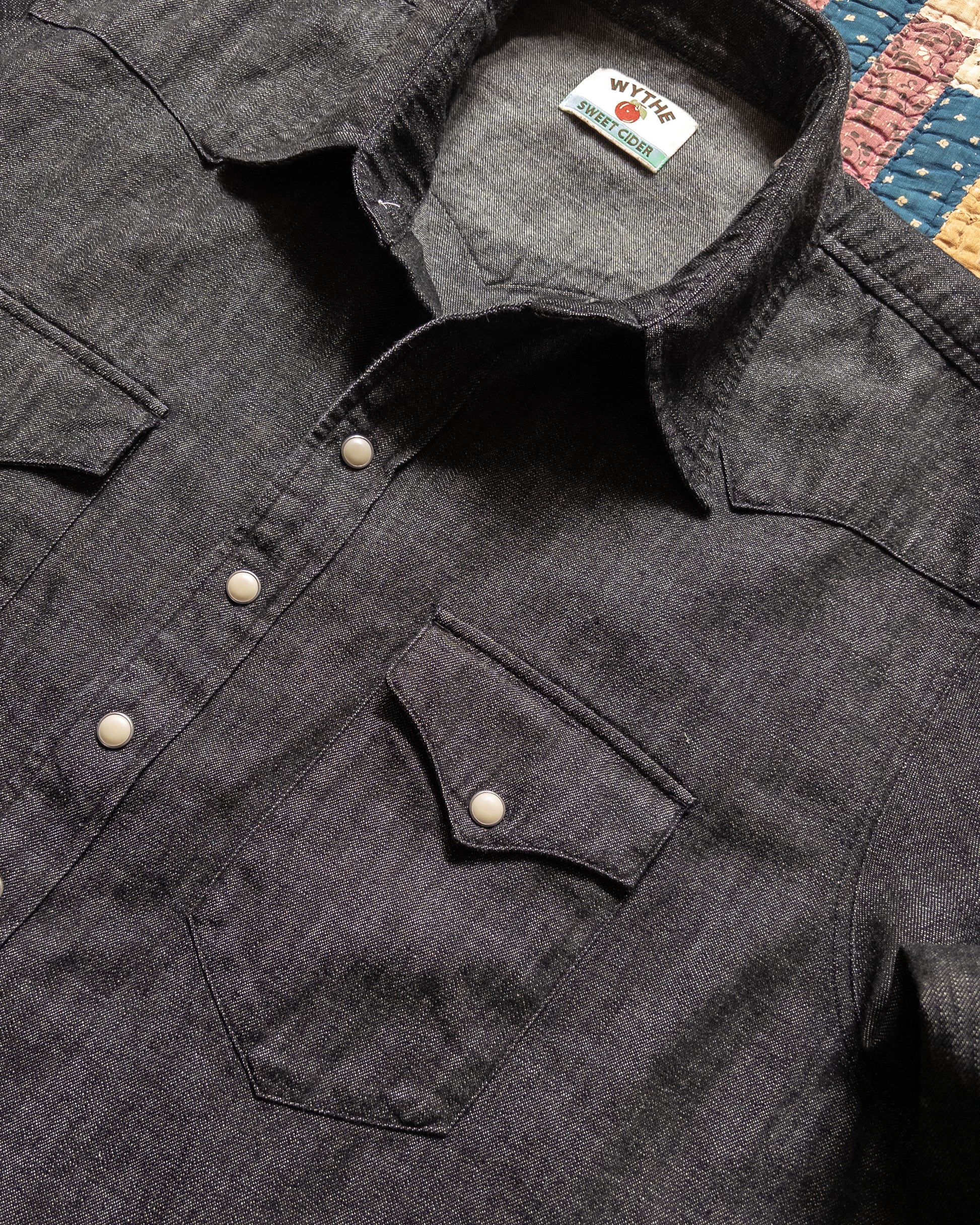 The real icon of the west now comes in black! Take it up a few steps with a rear western yoke mirroring the most beautiful patterns of the 1940s and 50s, and custom antiqued enamel pearl snaps. This shirt has all the details you'd expect of a real western shirt and then some. Expect less fading than you would on an indigo denim pearlsnap.