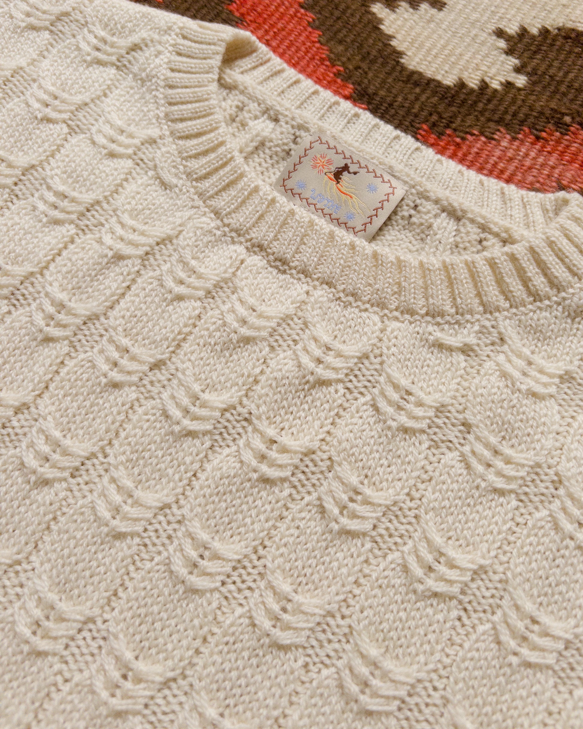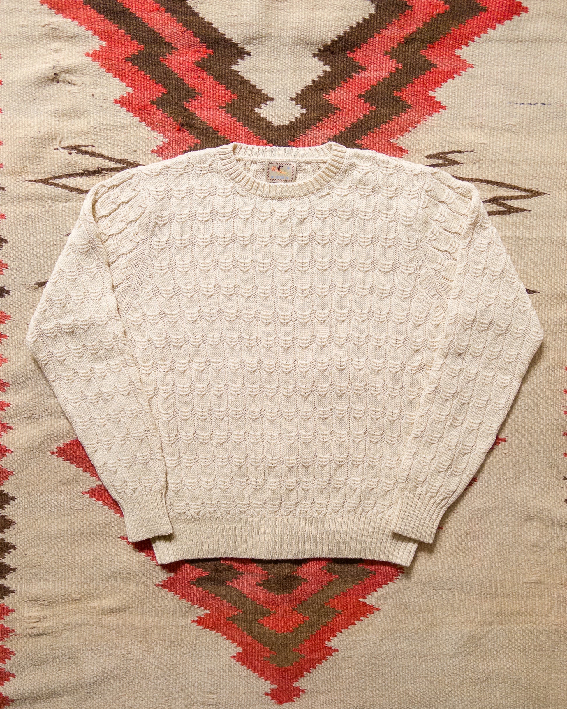 The cableknit sweater has clear and defined roots in vintage clothing. We kept pulling these cableknit sweaters out of our archive and continually said "wow, these are really good" enough times where we knew we had to make some ourselves. Inspired by older ivy sweaters, we worked with our new knitting parters in Peru to really knock these out of the park, and were able to come up with our own knitting pattern in the process.