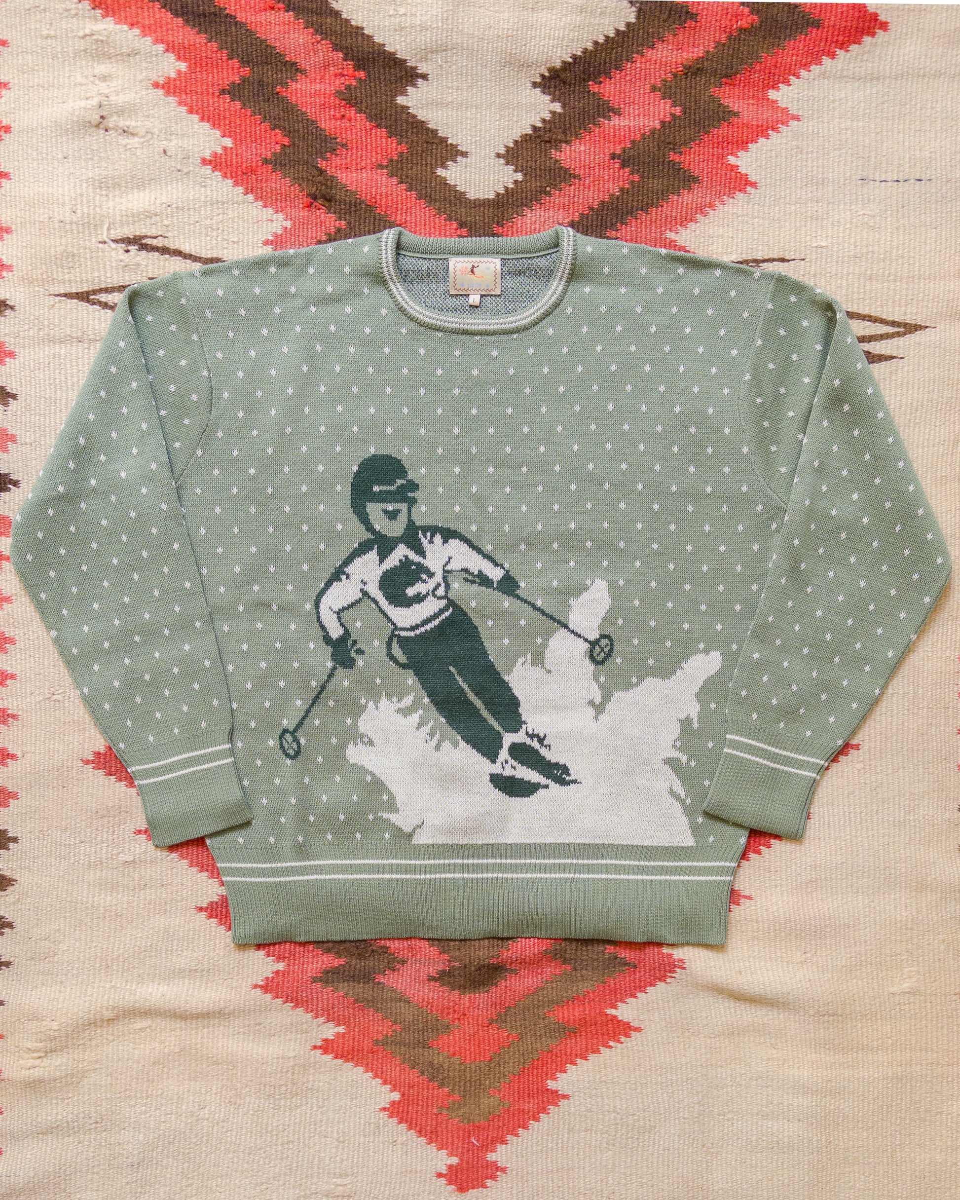 This is our first try and making a jacquard crewneck sweater and we couldn't be happier with the results. After finding this very old child's sweater featuring a skier motif, we knew we had to try our hand at something special to us. And since the armadillo is clearly something we love to use, the Downhill crewneck was born.