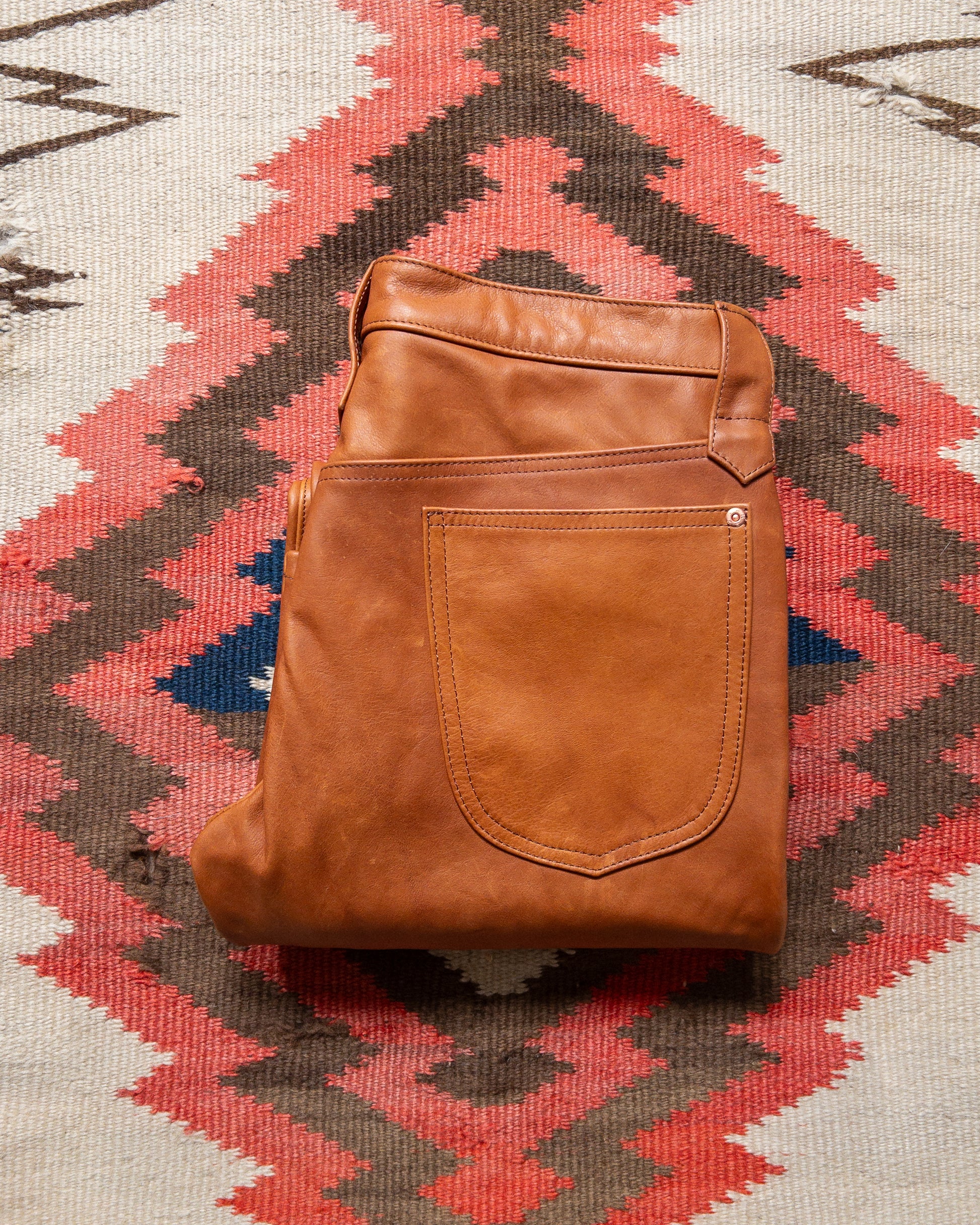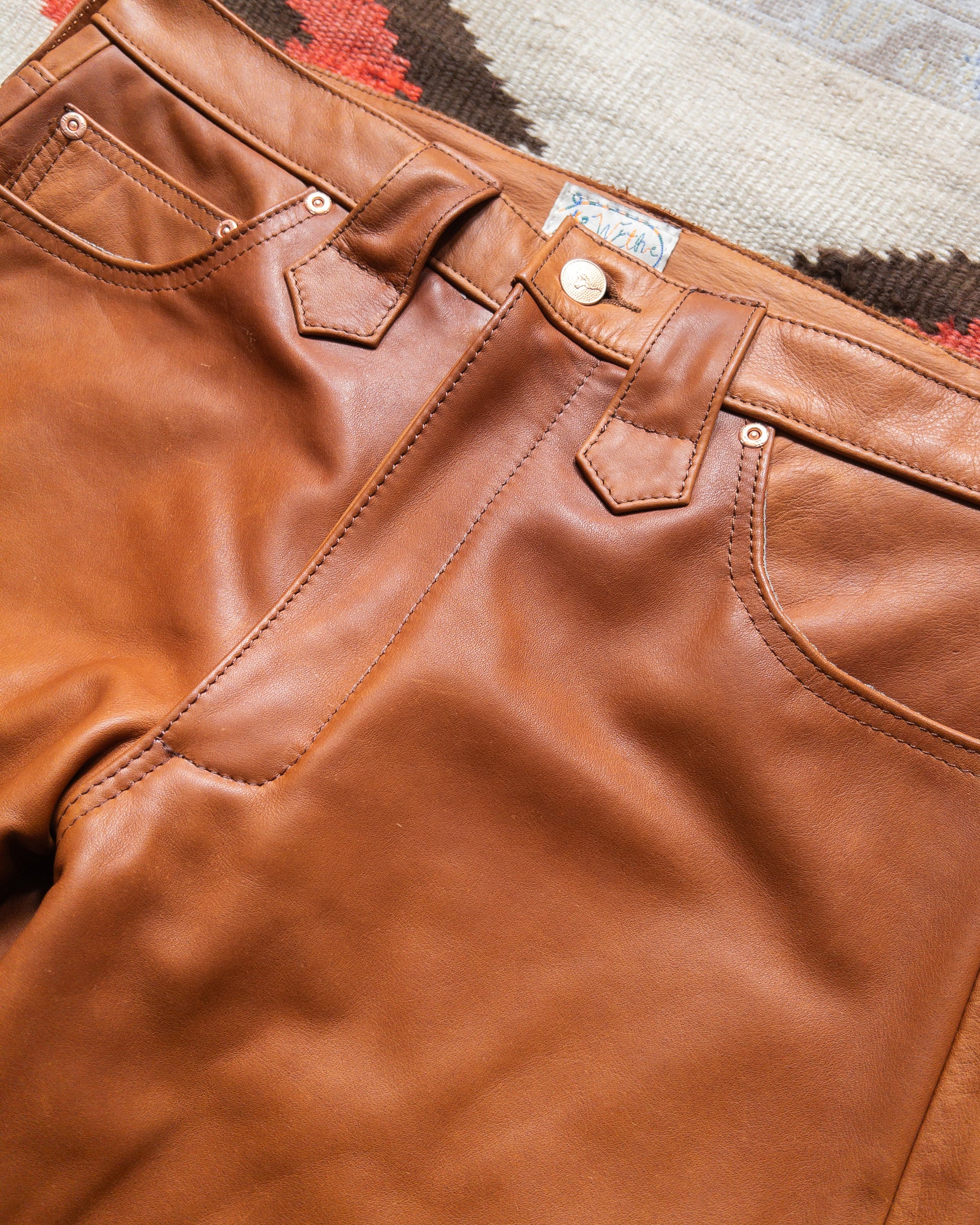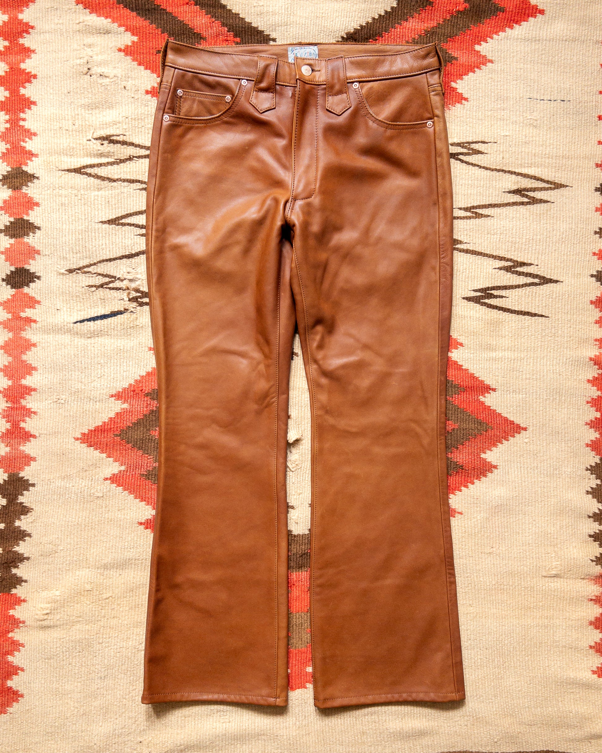 Our recent obsession with the 60s wouldn't be complete without leather flares - and we didn't mess around with these. Fitting like a typical five-pocket up top, the flares have a slight taper at the knee to help accentuate the outward curve of the flare below the knee. Half-lined with our cotton/viscose twill lining, these flares are as comfortable as they are substantial. We had just as much fun designing these as you will wearin' em. The best part? We made these right here in NYC.