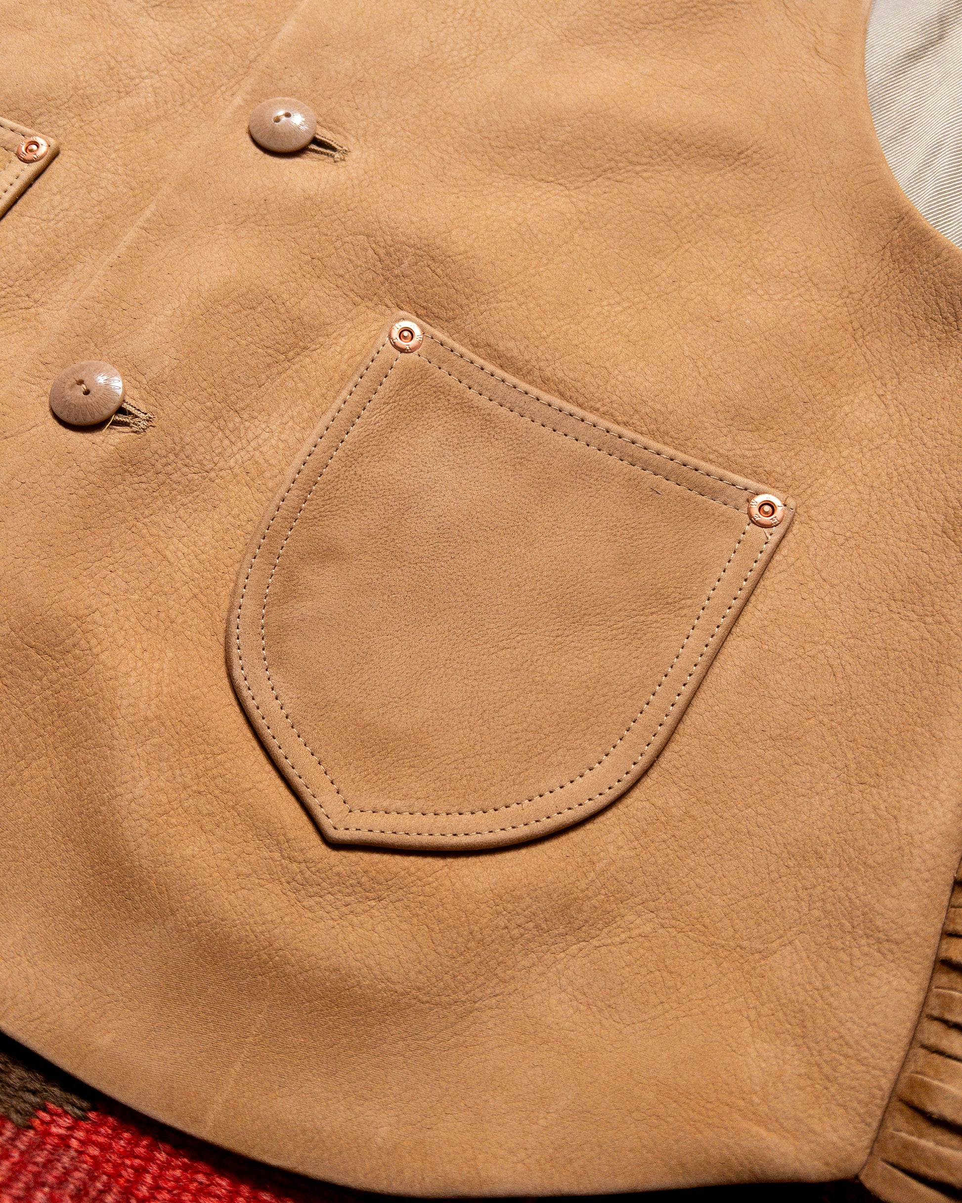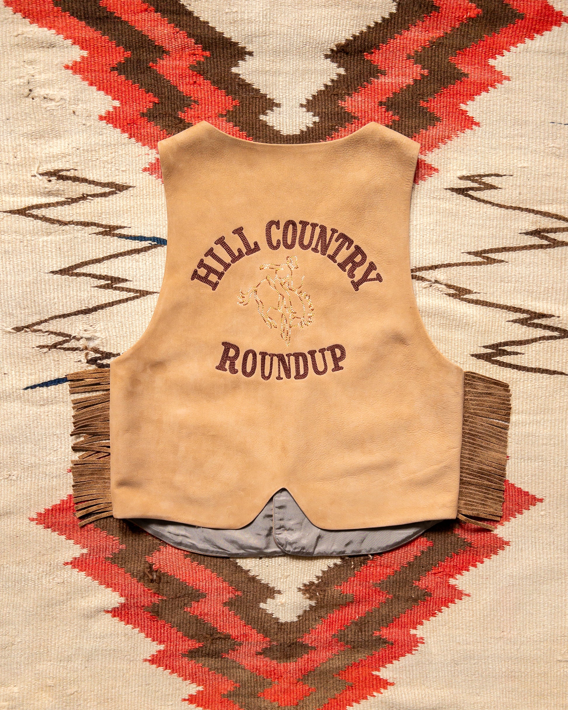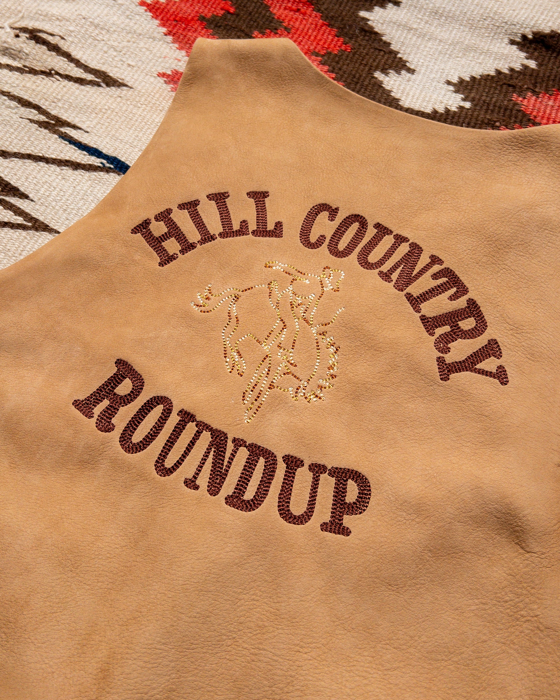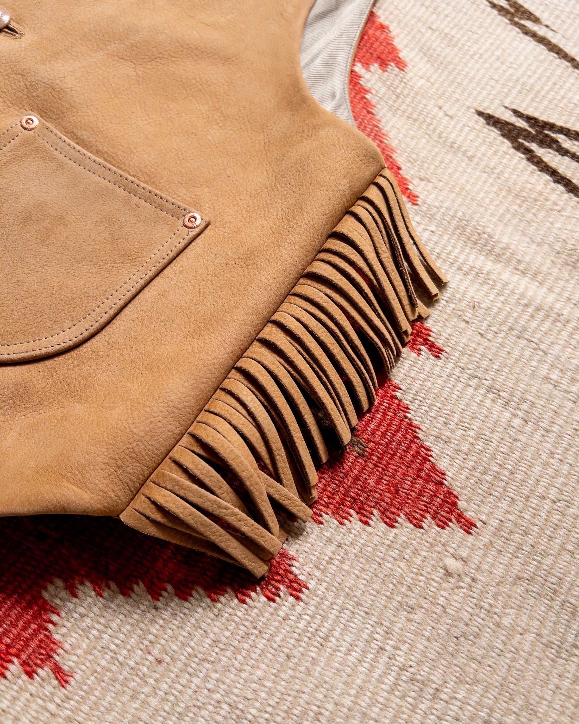 We're loving the fringe lately. Made using the same skin as our Honey Suede Five Pocket Flares. We applied just enough fringe so that it's still wearable without looking like you're coming off the stage at Woodstock. And to top it all off, our Hill Country Roundup motif is chainstitch embroidered across the back. Made in extremely limited quantities, right here in NYC.