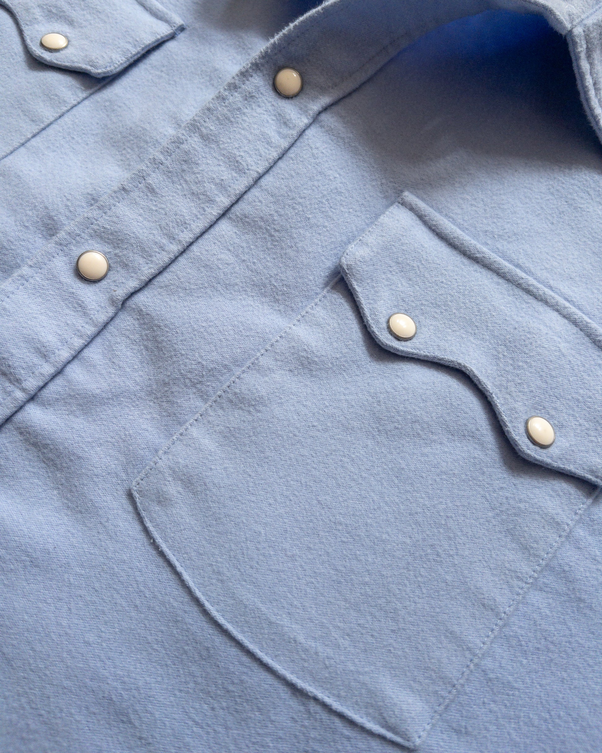 Inspired by classic chamois shirts with a slight western edge. These shirts are made of super soft cotton moleskin that feels like a well-worn vintage shirt straight out of the package. The cream pearl snaps are recreated from old enamel pearl snaps from the 50s that have yellowed with age.
