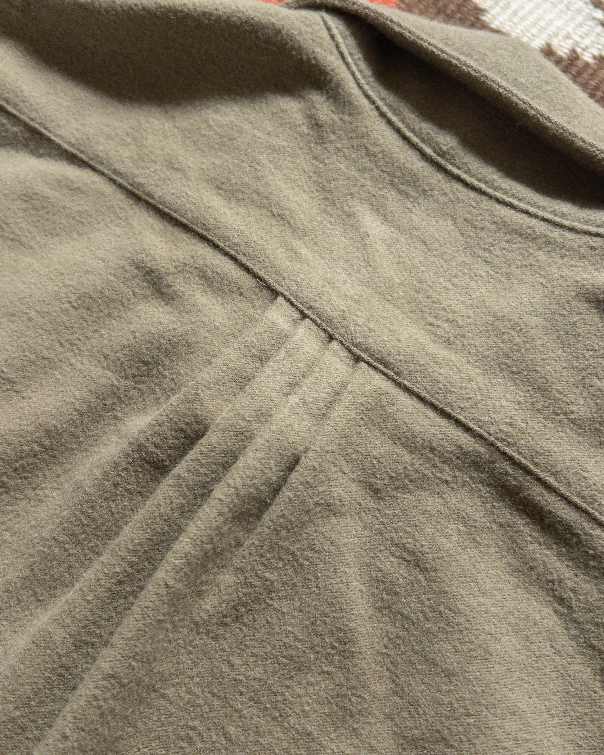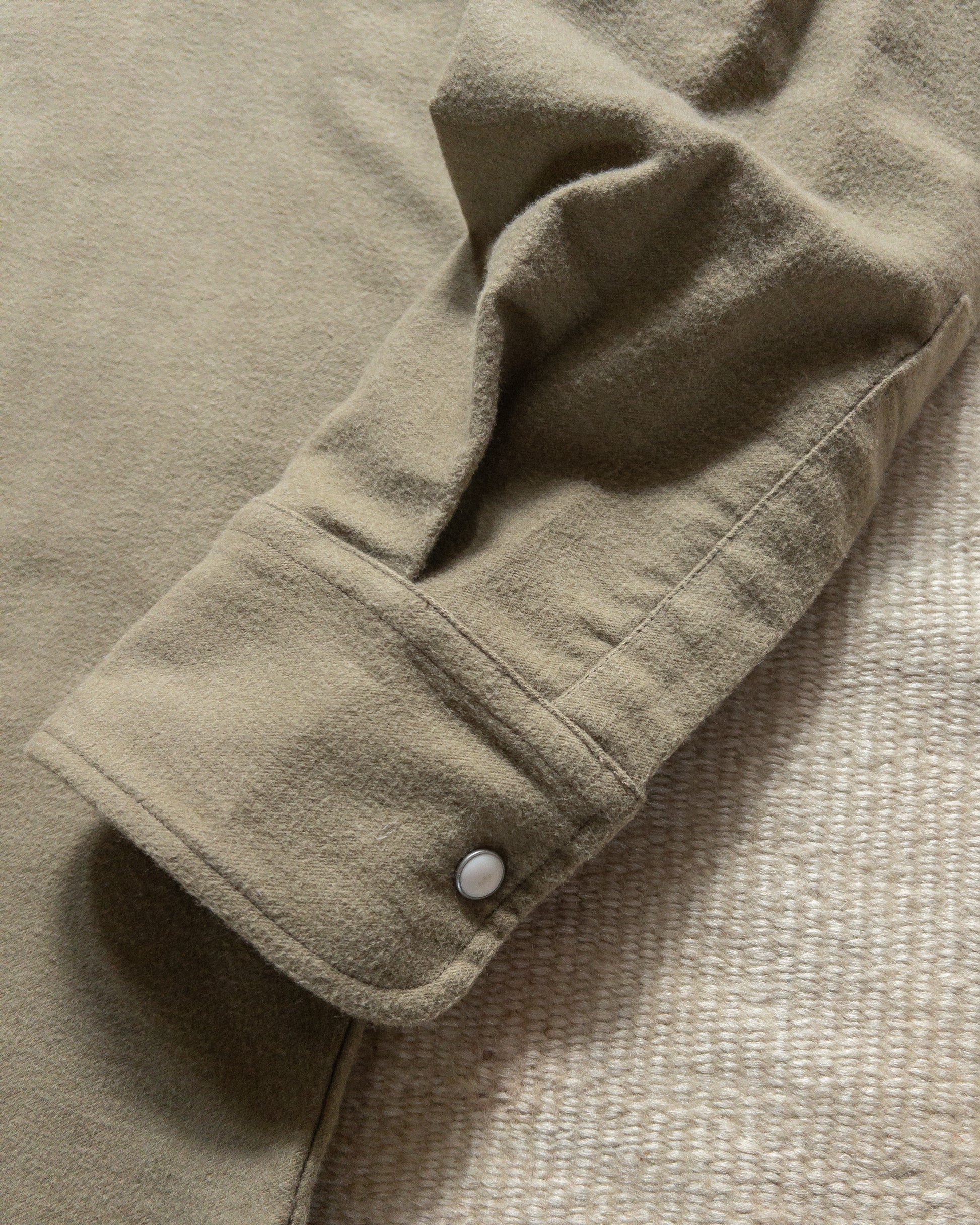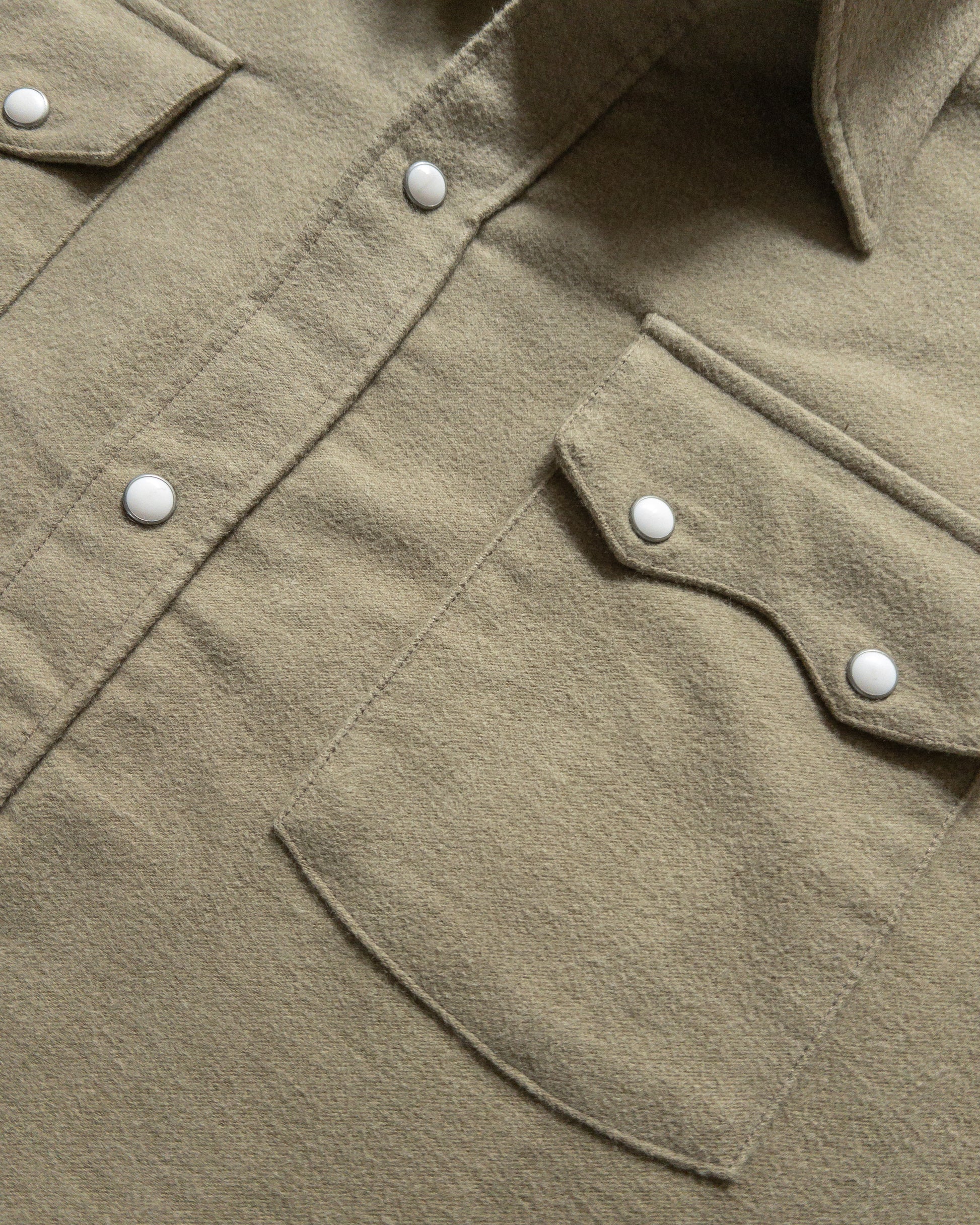Inspired by classic chamois shirts with a slight western edge. These shirts are made of super soft cotton moleskin that feels like a well-worn vintage shirt straight out of the package. The cream pearl snaps are recreated from old enamel pearl snaps from the 50s that have yellowed with age.