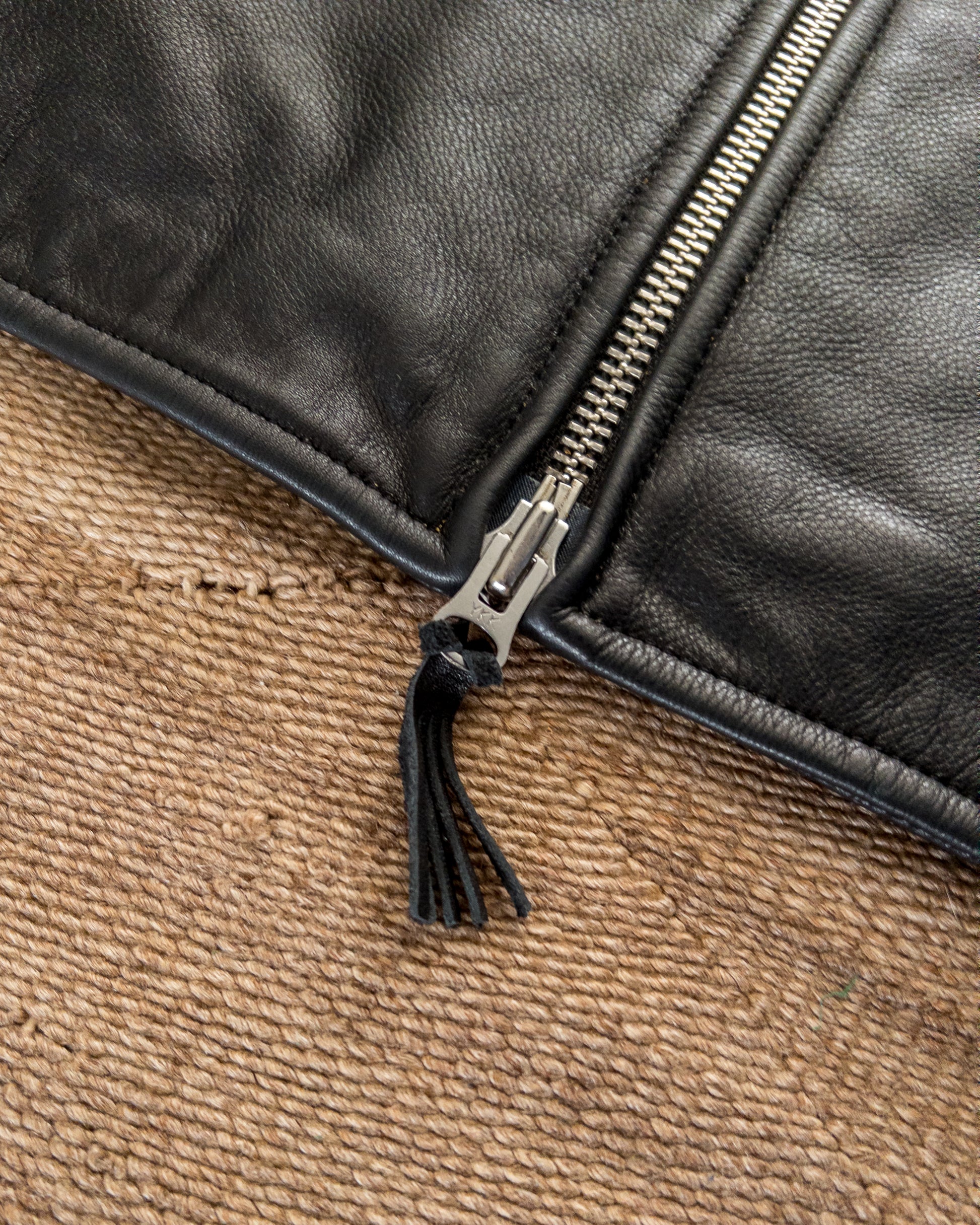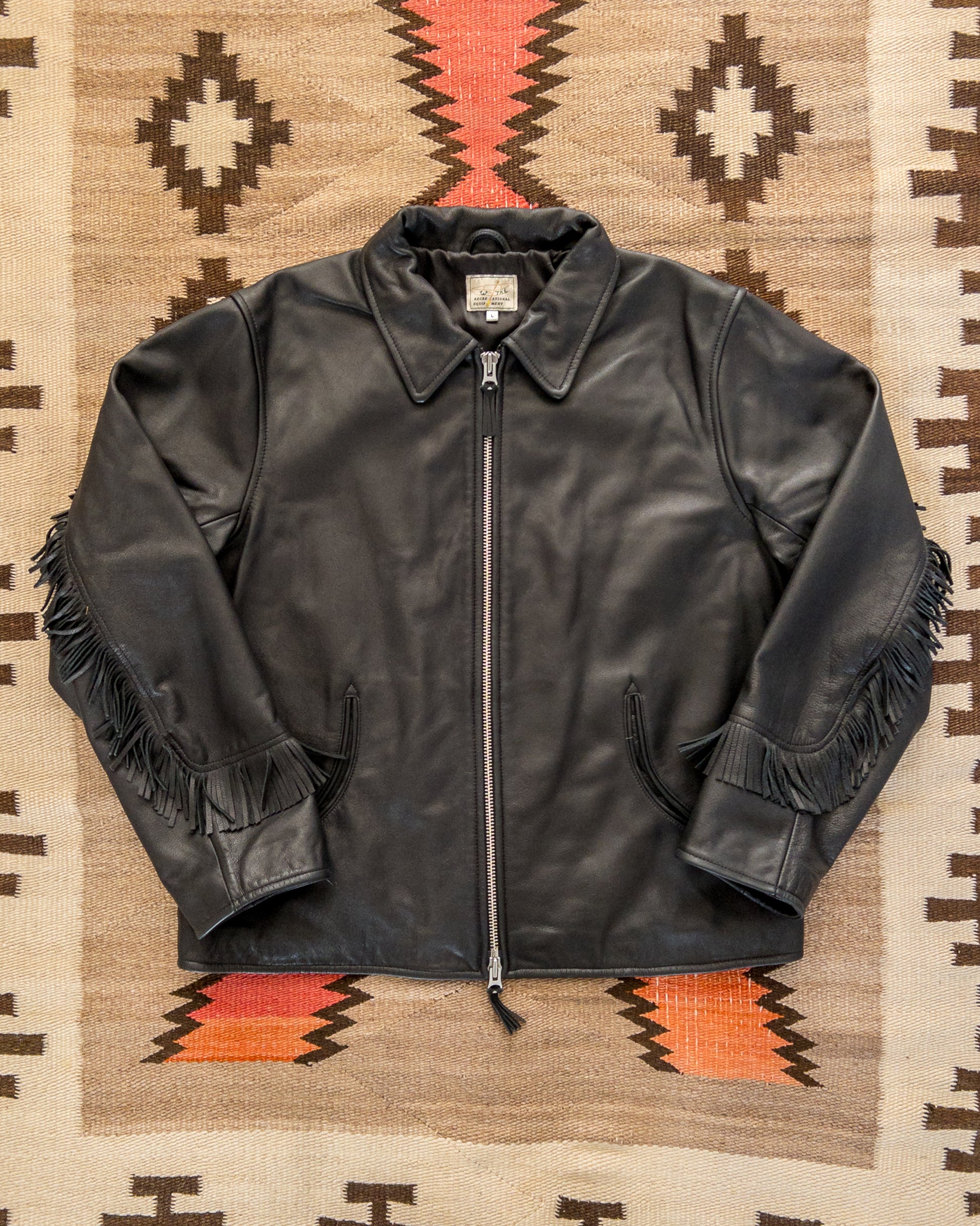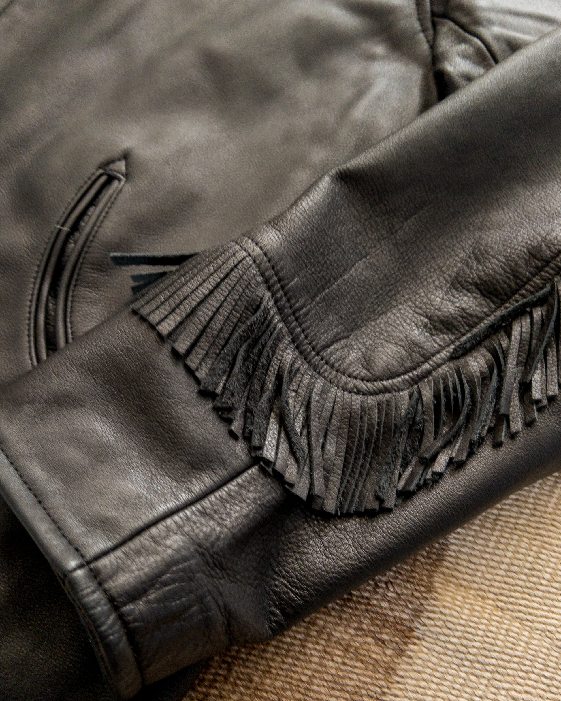 We were very pleased with our collaborative leather ranch jacket, so we decided to have some fun for ourselves. The Mustang is our nod to the jacket we admired on our wall. We even left in the side panels as a nod to the original owner. This jacket is made from a supple cowhide that needs very little break-in time. Featuring a contrasting collar (on the yellow and green colors), two-way YKK zippers with fringe pullers, smile pockets, fully lined, and just enough fringe to turn heads.