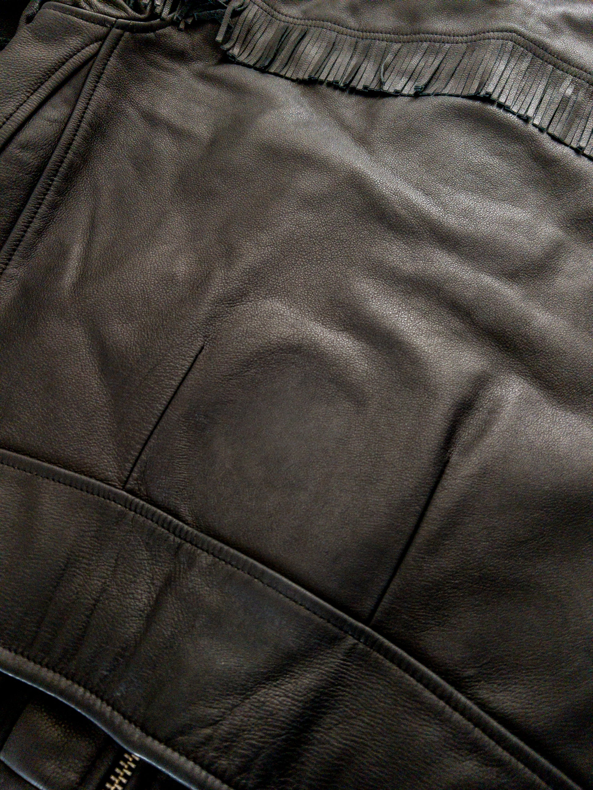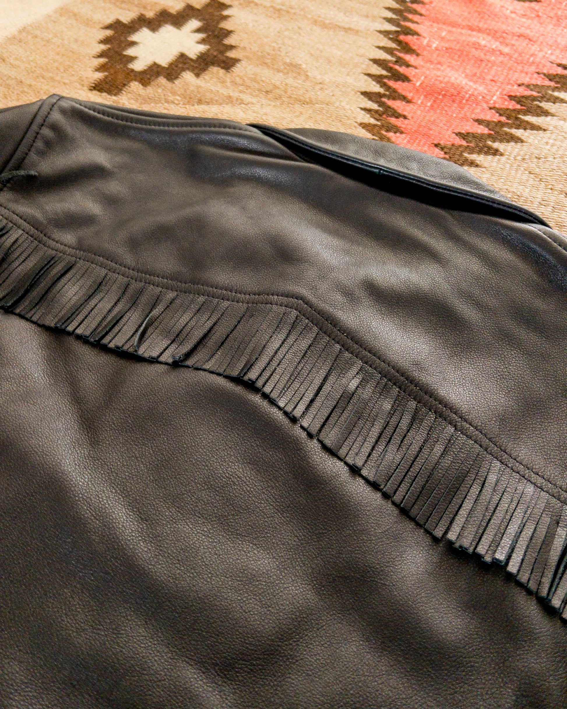 For years, we had this old 1930s leather fringe jacket hanging in the Wythe office - fun to look at and admire, but that was usually it. The jacket was handmade in the 1930s and was painted a gorgeous yellow color. Over time and wear, the paint had cracked and withered, but the leather was incredibly soft. A long fringe trim hung off the jacket across the front, down the sleeves, and across the back. Panels had been sewn in on each side where a previous owner, maybe the only owner, wanted some extra room to let out the jacket. We loved everything about it.