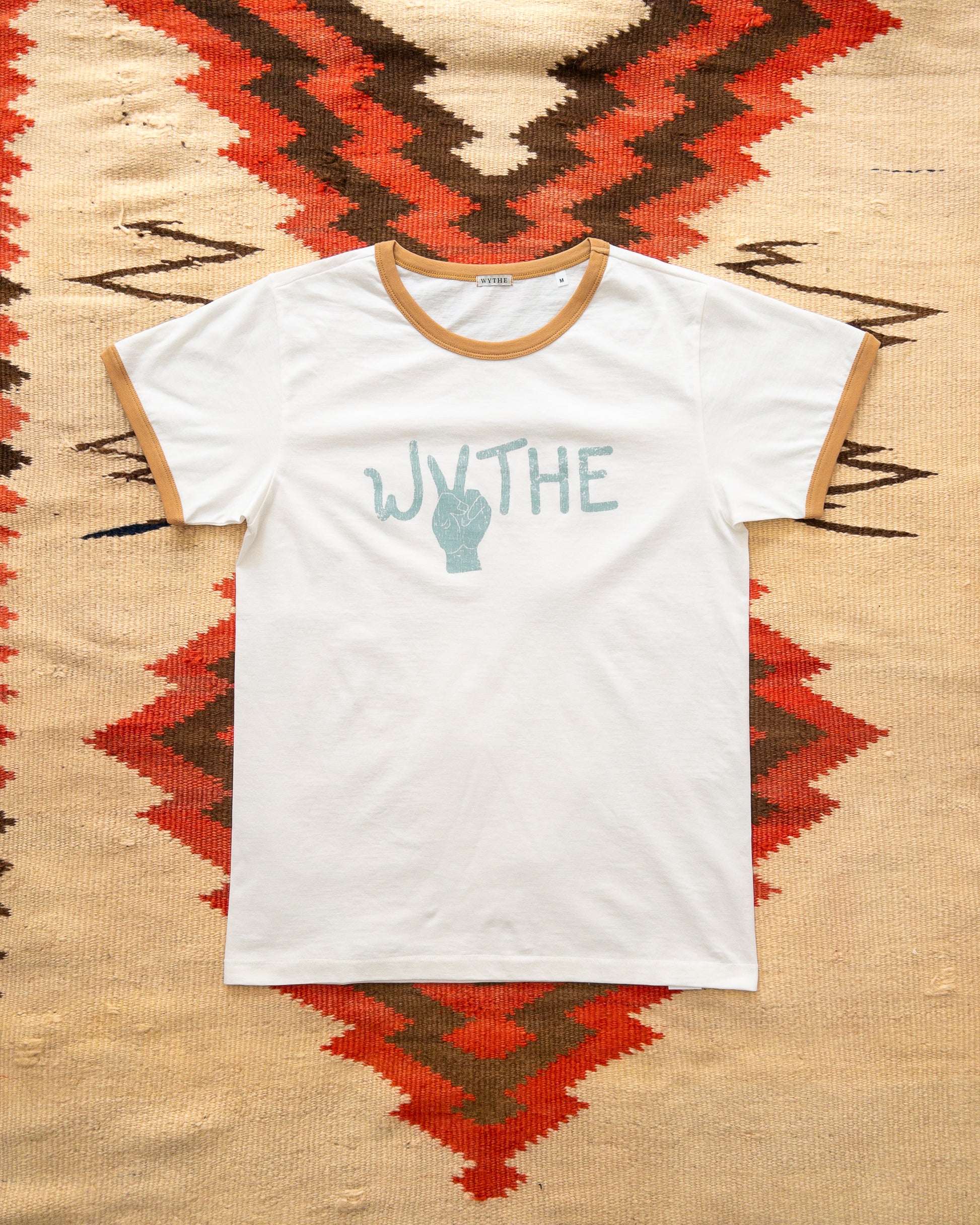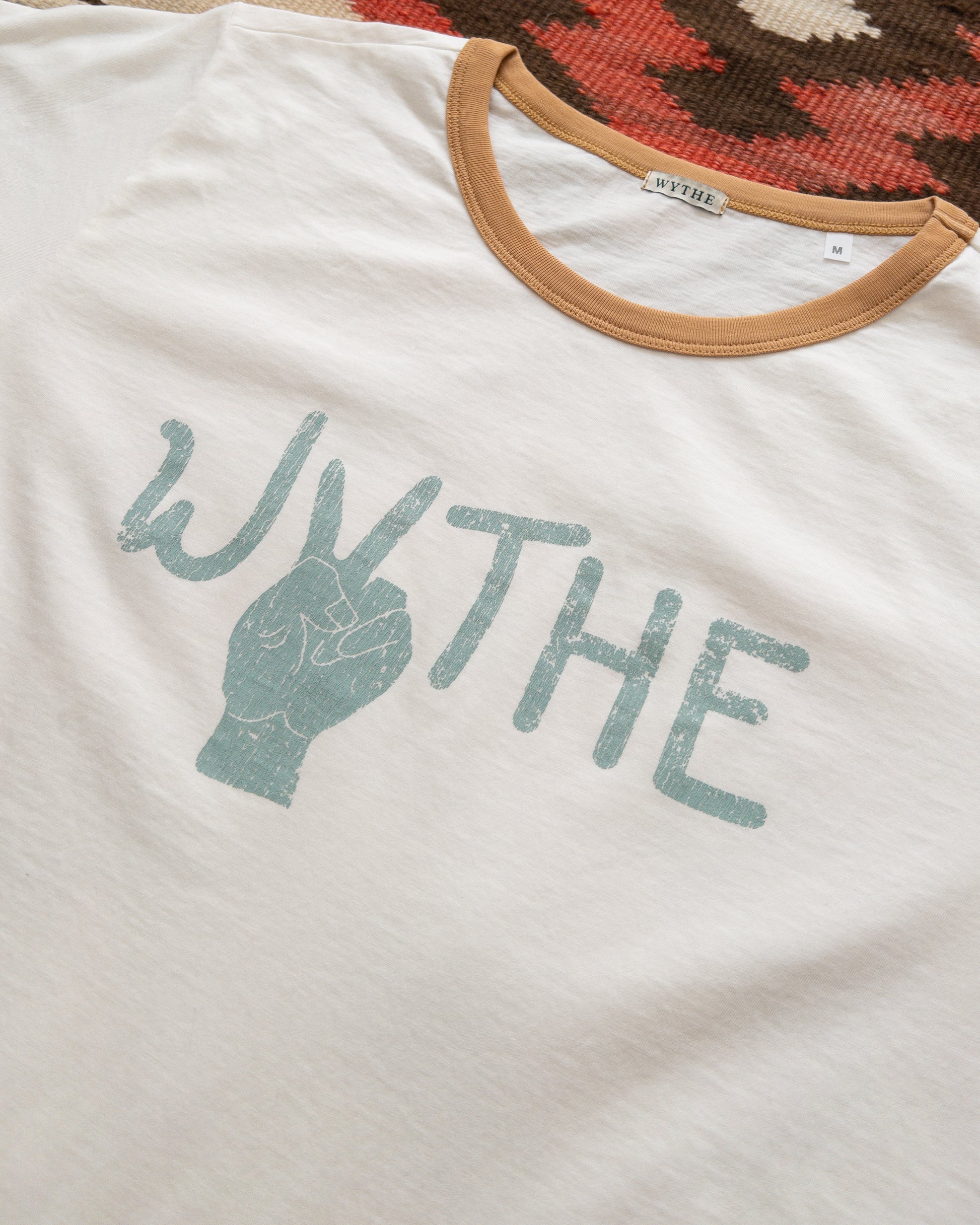 After scouring our archive for some of our favorite 60s ringers, we were inspired to start playing around with some common themes from that era. The "Peace" Wythe motif we came up with felt very fitting for a 60s-inspired ringer. This new ringer is built on our same tubular t-shirt body, but with a slightly narrower neckline and slightly longer sleeves for a more classic look.