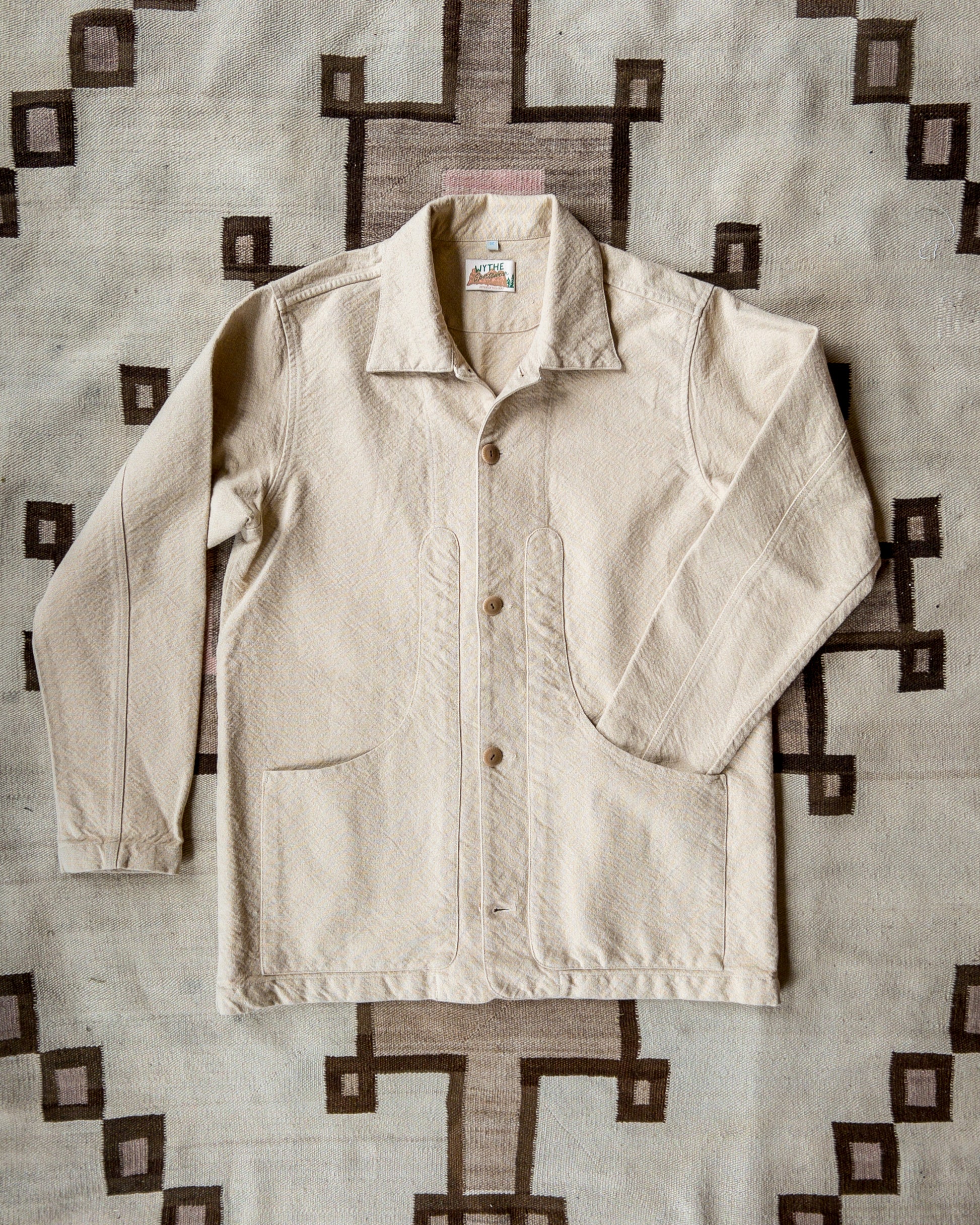 We'll never miss an opportunity to use an undyed yarn. There's somethin about a yarn's natural color that admire, and especially watching that natural color age and fade with wear. We worked with our partnering mill to develop this cotton/linen canvas. It features a special twist in yarns which allows the canvas to have structure but also be open and airy. We love wearing it over a tee or tank top for some easy summer layering. This ain't your average chore coat!